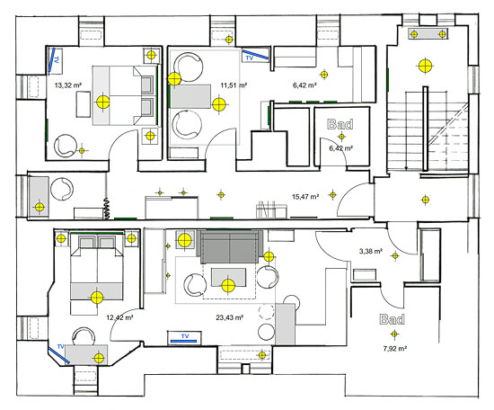 Alle Wohnungen sind sehr geräumig und umfangreich ausgestattet. Sie verfügen über unterschiedlich eingerichtete Bäder mit Dusche (teilweise noch mit Badewanne oder Eckbadewanne) und WC, Flachbildfernseher, sowie Schreibtisch und eine separate Sitzgelegenheit zum gemütlichen Weintrinken oder Lesen. Die Küchen sind komplett eingerichtet.
