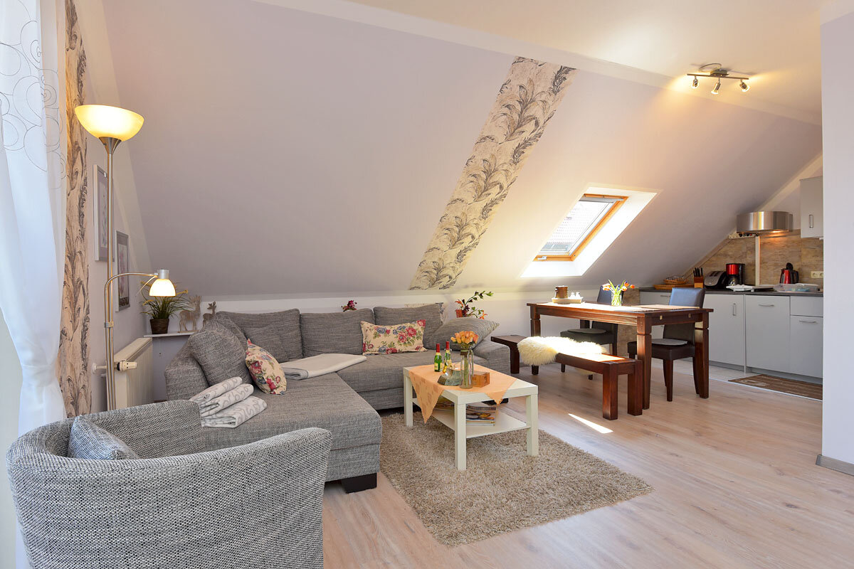 Die 65 qm Nichtraucher-Ferienwohnung im Obergeschoss ist geschmackvoll eingerichtet und bietet alles, was Sie zum Wohlfühlen brauchen. Von hier haben Sie einen traumhaften Blick auf die umliegenden Bergwiesen und Wälder.