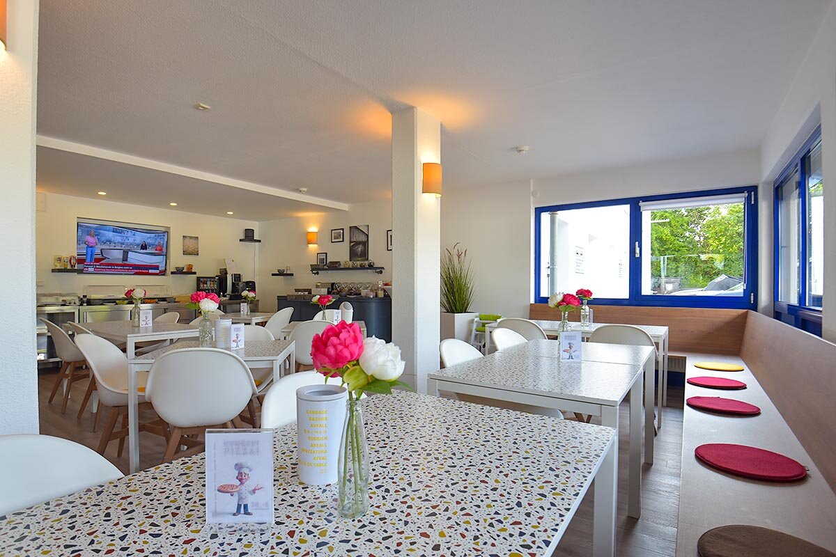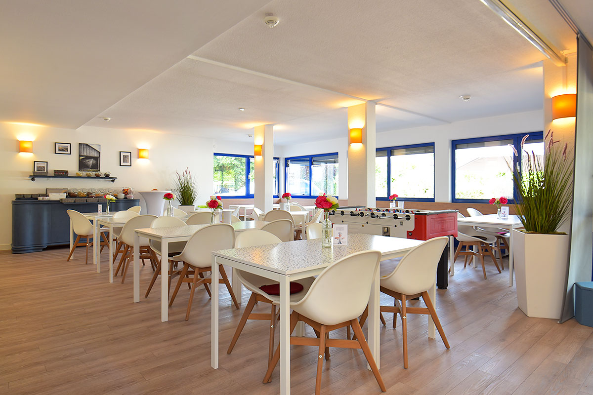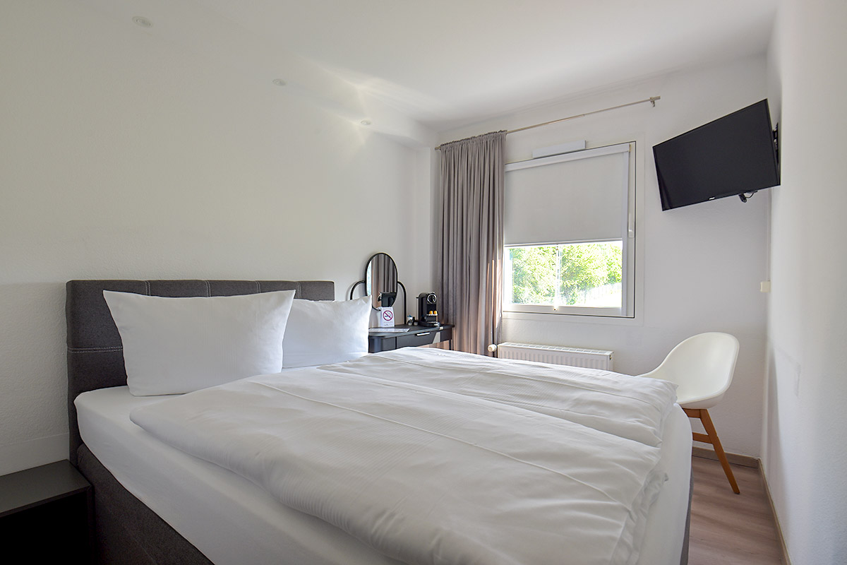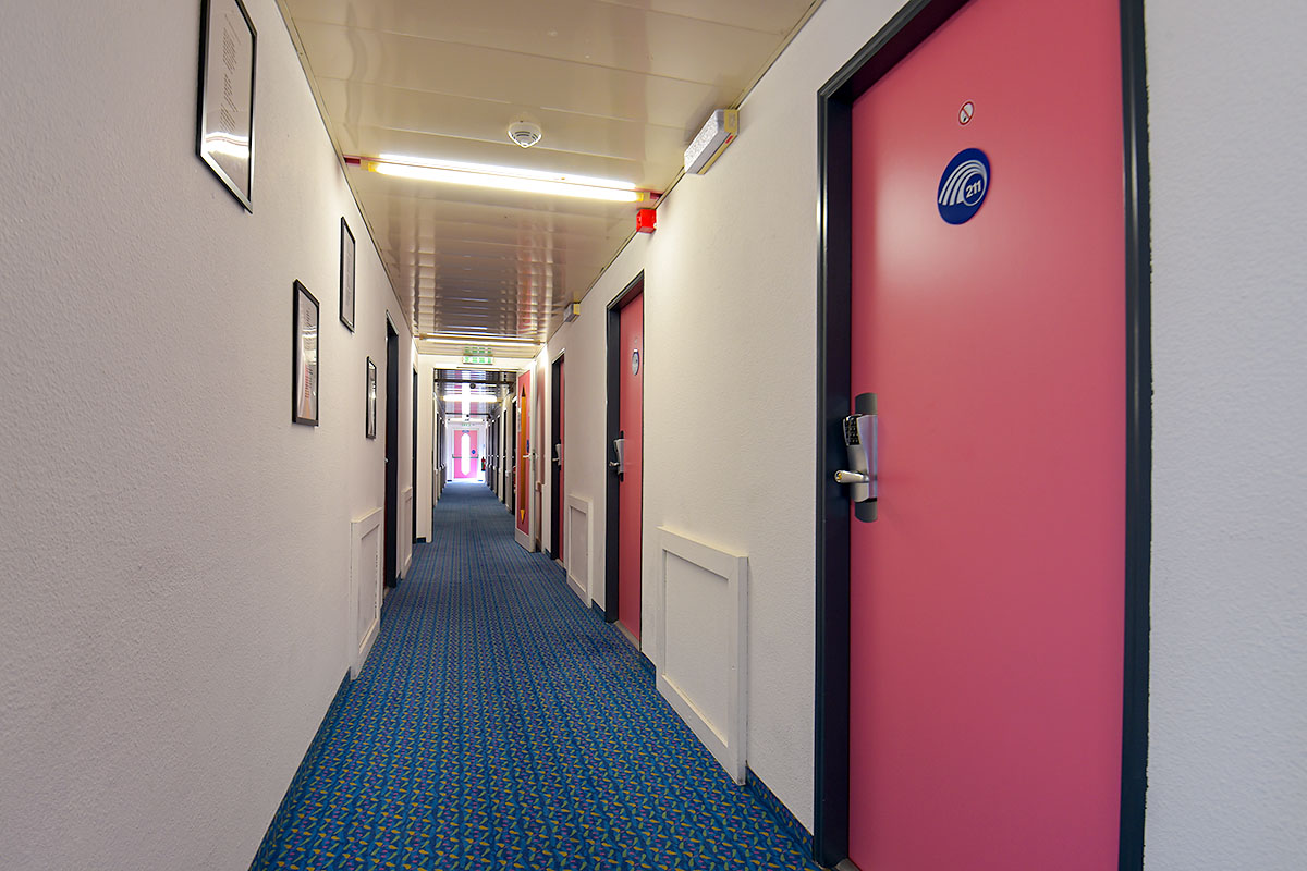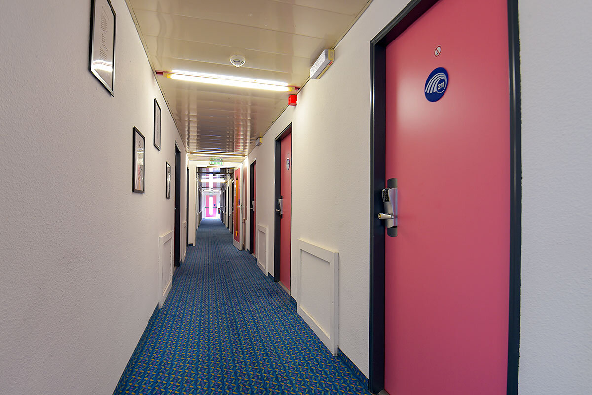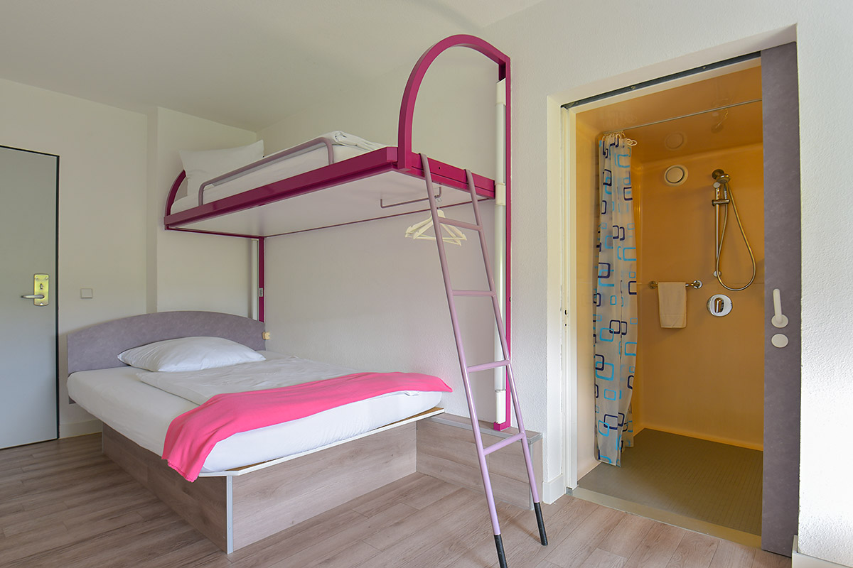 Unsere 65 funktionalen Zimmer verfügen über französische Betten oder Etagenbetten, einen eigenen Waschtisch, Bad mit Dusche und WC sowie einen Fernseher – alles für eine entspannte Nacht.