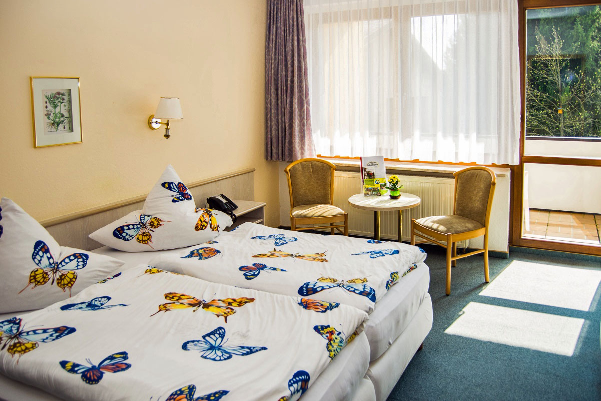 Sie wohnen in einem unserer 29 Doppel- oder 5 Einzelzimmer, die alle ausgestattet sind mit Dusche/WC, Radio, Schreibtisch und Sat-TV sowie teilweise mit Balkon. Genießen Sie den herrlichen Blick in unser weiträumiges Außengelände. In allen Zimmern ist freier Internetzugang möglich.