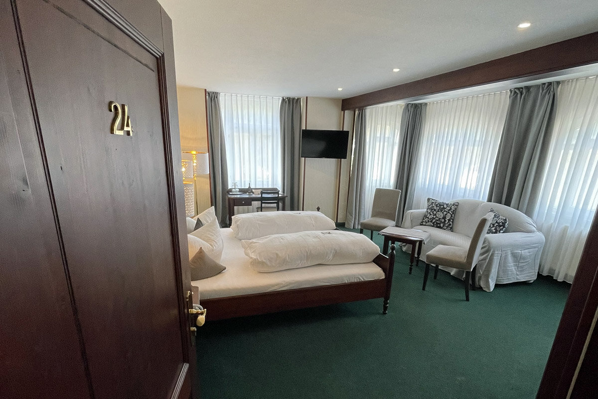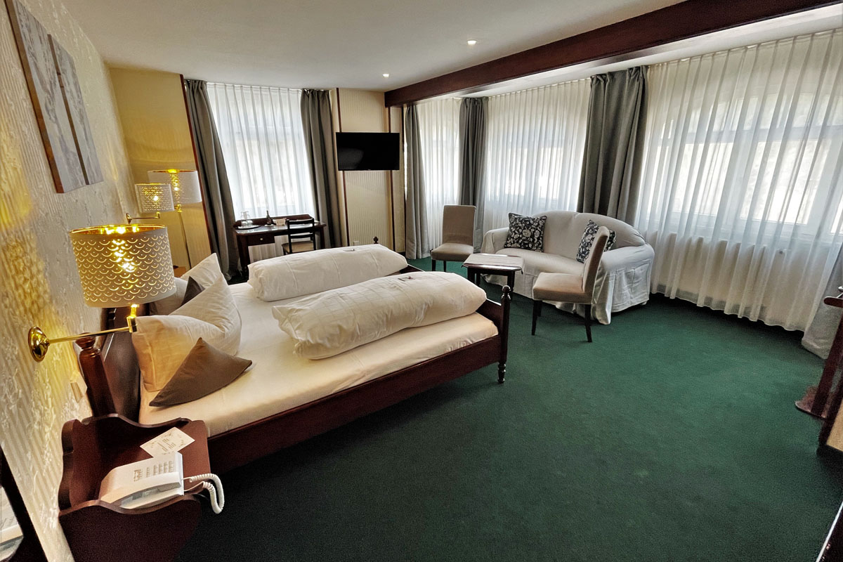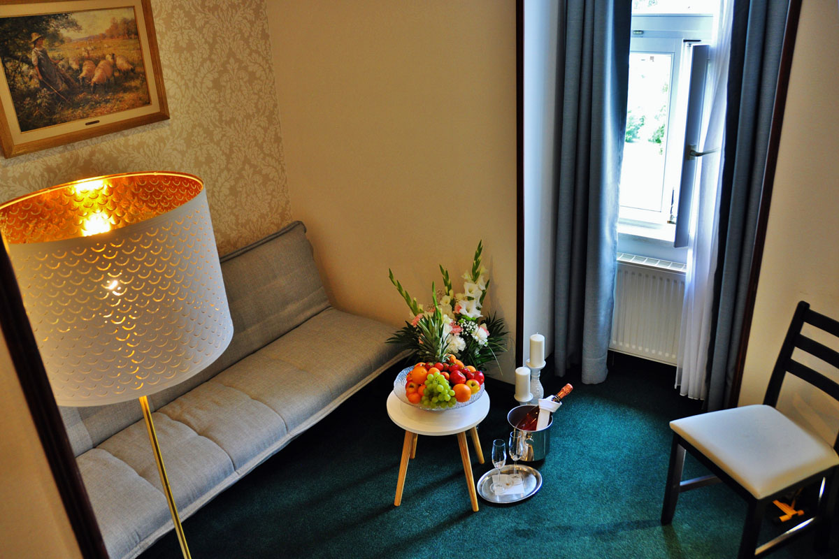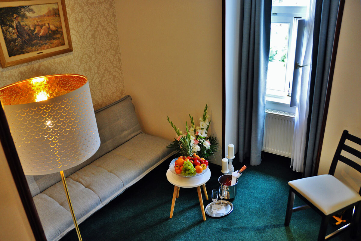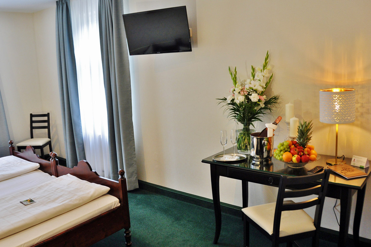 Unsere Gästezimmer verfügen über Telefon, TV, Dusche, WC, teilweise Balkon und machen selbst den längeren Aufenthalt zum Vergnügen. Wer einen Rückzugsort der besonderen Art sucht, kann in unserem Ferienhaus im Hotelgarten übernachten.