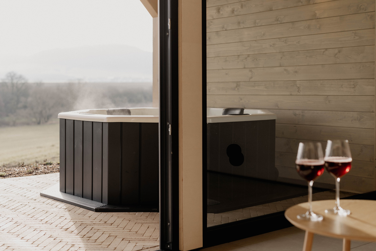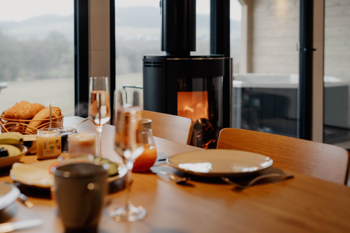 Die Hüttenchalets in der thüringischen Rhön sind ein Rückzugsort mitten in der Natur. Ankommen, durchatmen und loslassen – mit Blick auf Wälder und Wiesen erlebt ihr Ruhe, Weite und echte Auszeit. Der Panoramablick, der private Outdoor‑Whirlpool sowie die Sauna & der Kamin im Chalet sorgen für Entspannung pur.