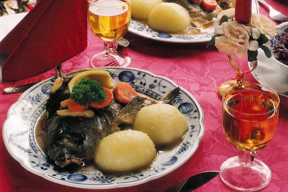 Von September bis April Karpfen aus eigener Aufzucht nach Urgroßmutters Rezept mit original handgerührten Thüringer Klößen. (Wir bitten um Voranmeldung, da die Zubereitungszeit der fangfrischen Karpfen etwas länger dauert.)