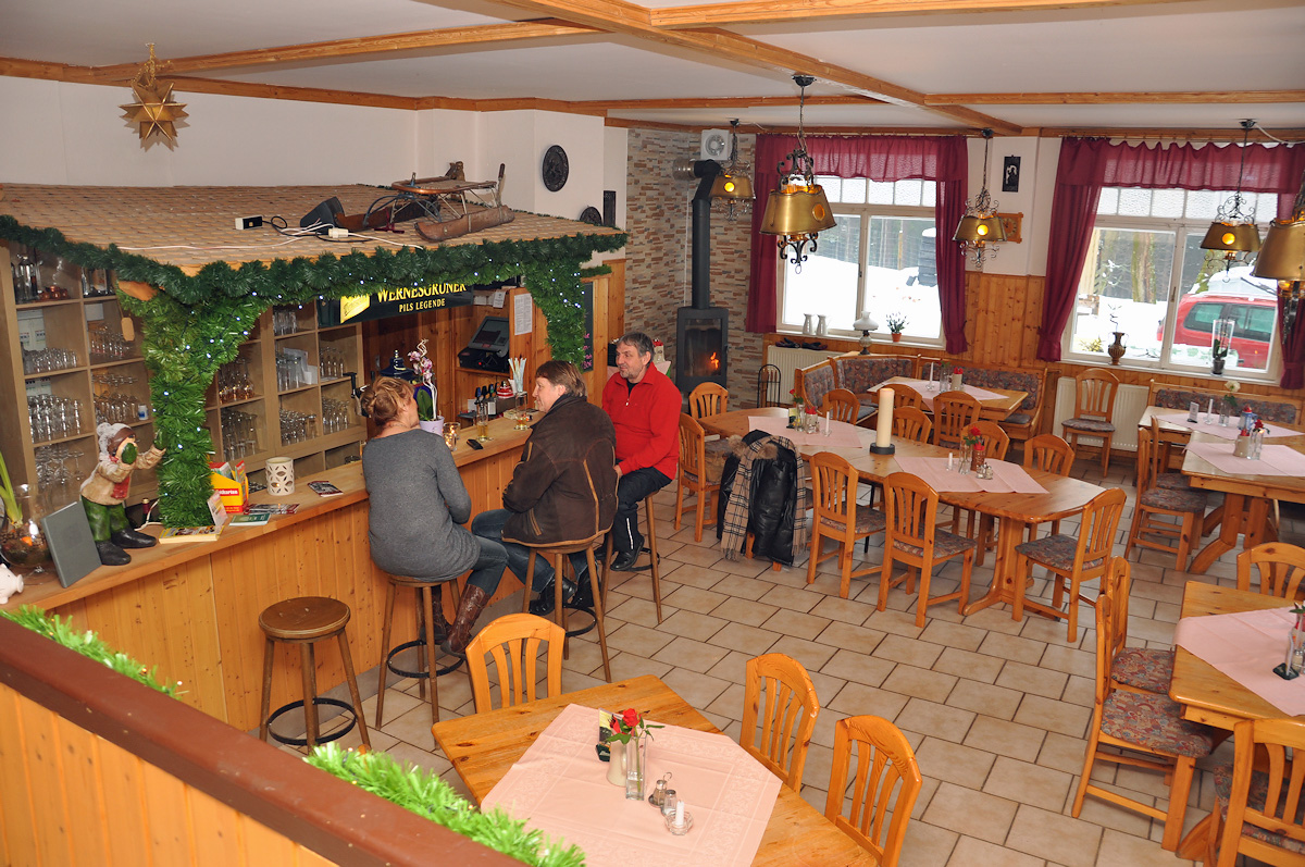 Idyllisch und ruhig liegt unsere Pension mit Restaurant in Allein- und Außenlage mitten im Thüringer Wald etwas unterhalb der Rennschlitten- und Bobbahn, der Jugendschanze und des alpinen Skihanges respektive des Mountainbike-Single-Trail-Parcours.