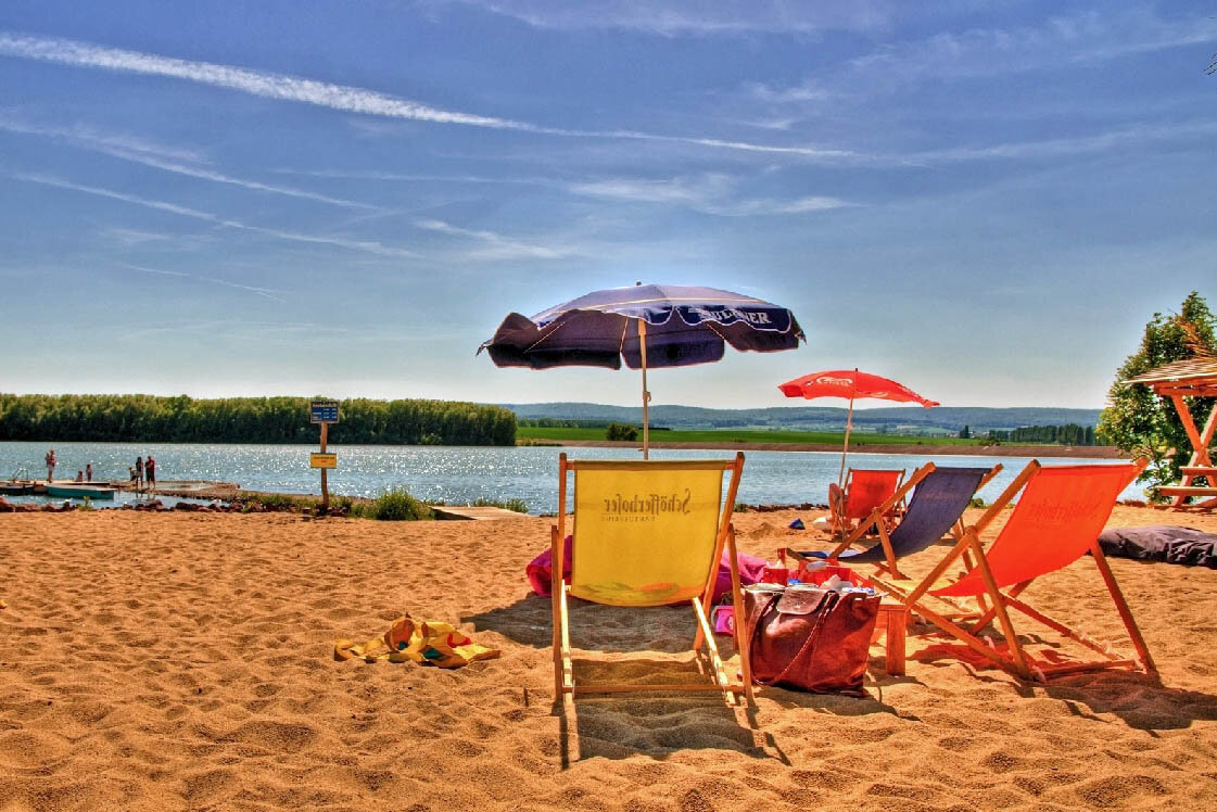 Ich sitze hier also am Strand von Thüringen, mitten in Deutschland - Luftlinie nicht mehr als 1 km vom geografischen Mittelpunkt Deutschlands entfernt. Alles grün. Tür an Tür mit der Natur. Und so eine Stille. Vogelgezwitscher, Fröschequaken, see-eigene Schwäne und ein paar Fische, die ihren Wassertanz aufführen. Herrlich.