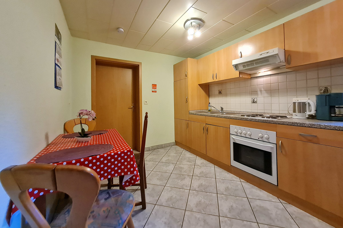 Eine kleine Ferienwohnung für bis zu 3 Personen verfügt neben einem kombinierten Wohn-und Schlafzimmer über eine separate Einbauküche mit Esstisch.
