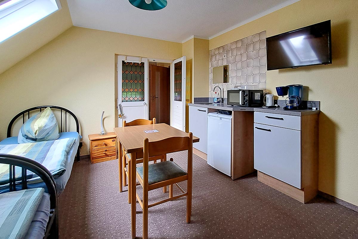 Vorhanden sind Einzel- und Doppelzimmer, Kühlschrank, WLAN, TV, Dusche und WC auf der Etage (pro zwei Zimmer), die Ausstattung für einen gemütlichen Grillabend im Garten und drei Gästeparkplätze.