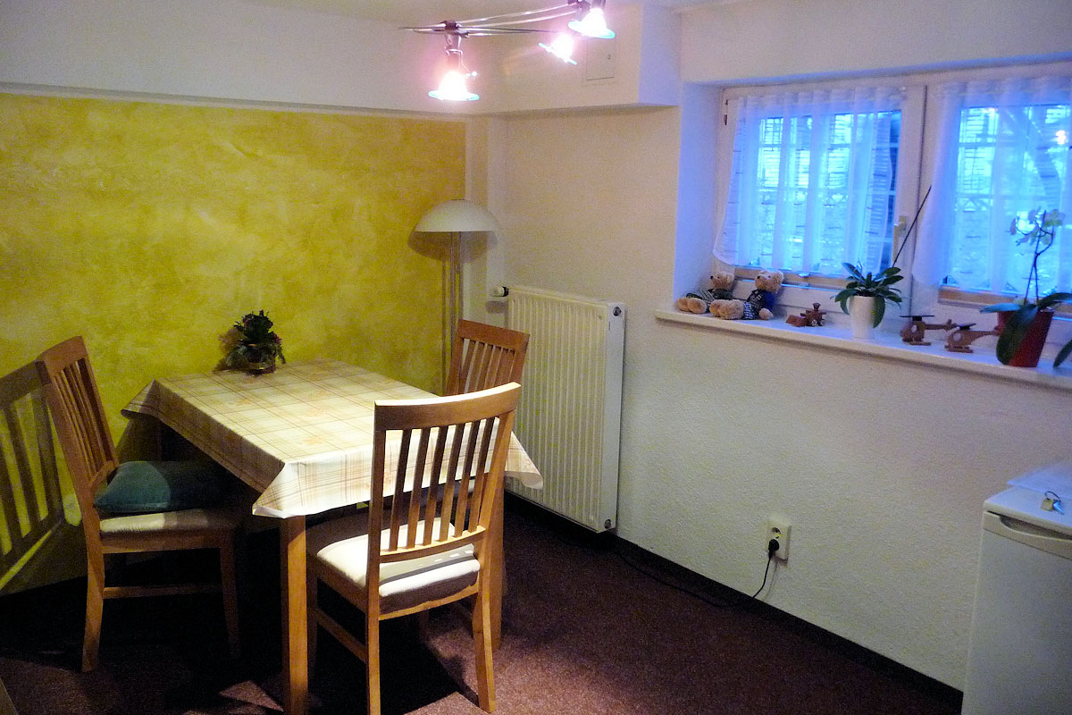 Im EG befindet sich eine kleine gemütliche Ferienwohnung mit speparaten Eingang, Dusche/WC, einem französichen Bett, einer Essecke sowie der Möglichkeit der Gartennutzung und einem eigenen Autostellplatz. Diese Ferienwohnung verfügt allerdings über keine Küche, so dass Sie sich hier nur Ihr Frühstück und kaltes Abendbrot bereiten können. Ausreichend Gläser und Geschirr sowie ein Wasserkocher sind natürlich vorhanden. Sie bietet sich ideal für Paare oder Alleinreisende an, die aktiv den ganzen Tag unterwegs sind und dann auch die abwechslungsreiche Jenaer Gastronomie für sich entdecken wollen.