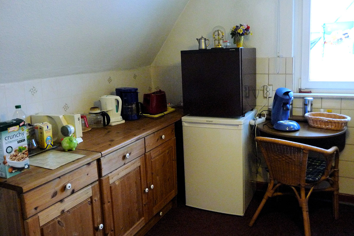 Besonderer Service: Ein immer gut gefüllter Getränkekühlschrank, aus dem Sie sich gern bedienen können. Die Abrechung erfolgt über eine Kasse des Vertrauens.