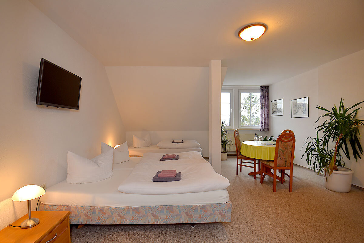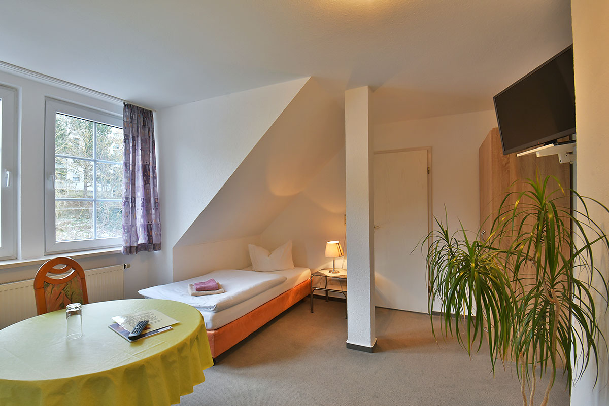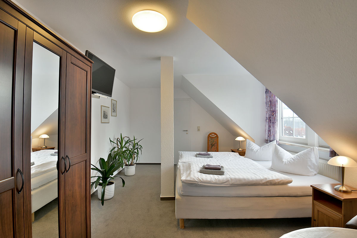 Alle Einzel-, Doppel- und Dreibettzimmer sind Nichtraucherzimmer und verfügen über Dusche, WC und Sat-TV. Ein Dreibettzimmer ist mit Badewanne ausgestattet.