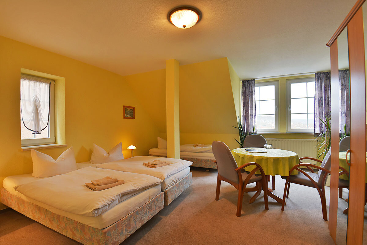 Es erwarten Sie 13 geschmackvoll und individuell eingerichtete Gästezimmer, teilweise mit Blick zur Wartburg, zum Burschenschaftsdenkmal und über Eisenach.