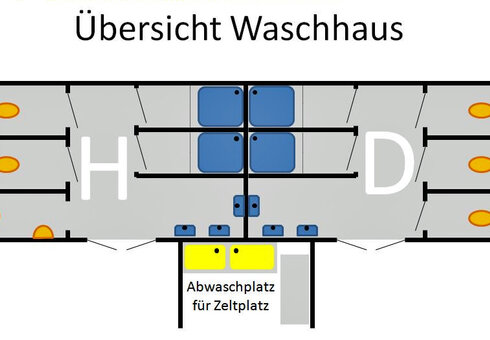 Eigens errichtet und modernisiert zur optimalen Nutzung der Wanderhütten und Zeltplätze verfügt das Waschhaus über für Damen und Herren getrennte Abteile, welche über je zwei Duschen mit Warmwasseranbindung, zwei Waschbecken und mehrere Toiletten verfügen. Vor dem Waschhaus befindet sich ein zentraler Abwaschpunkt für Küchen-equipment unserer Zeltgruppen und Gäste der Wanderhütten 2+3.