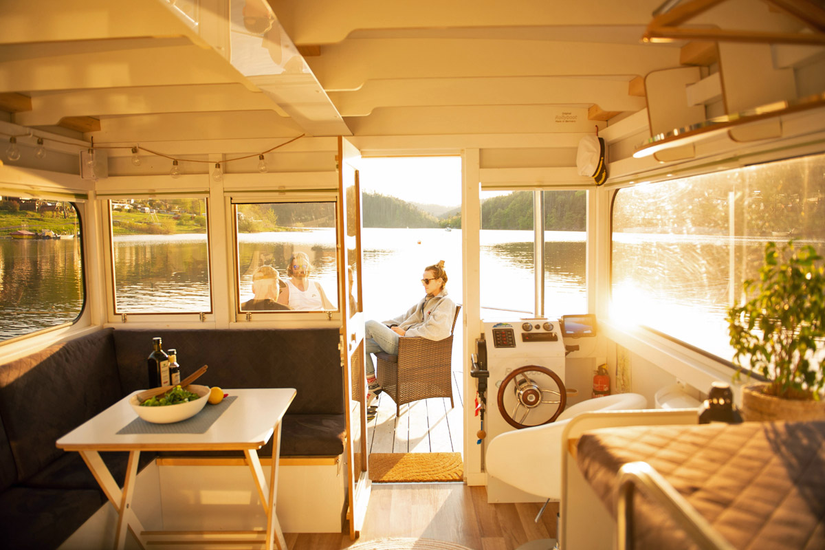 Die Innenausstattung unserer beiden Hausboote besitzt alles, was man an Bord für einen perfekten Aufenthalt benötigt. Ob Frühstück auf der Terrasse, Yoga auf dem Sonnendeck oder einem Glas Wein unter freiem Sternenhimmel... Kommen Sie in den Genuss des vollkommen autark ausgestatteten Hausbootes und lassen Sie sich treiben.