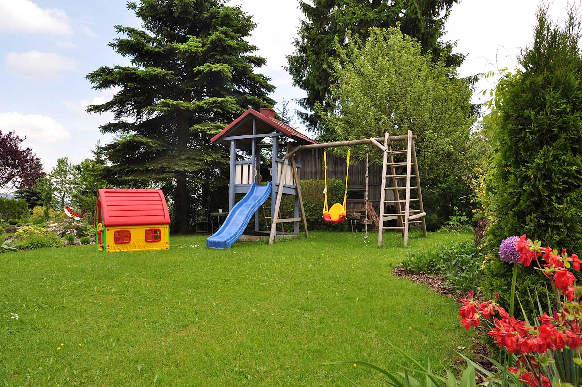 Unser Garten bietet mit ca. 1.800 qm genügend Freiraum und Ruhe für die ganze Familie, genießen Sie die eingebauten Ruheinseln oder schauen Ihrem Nachwuchs beim Spielen auf dem hauseigenen Spielplatz zu.