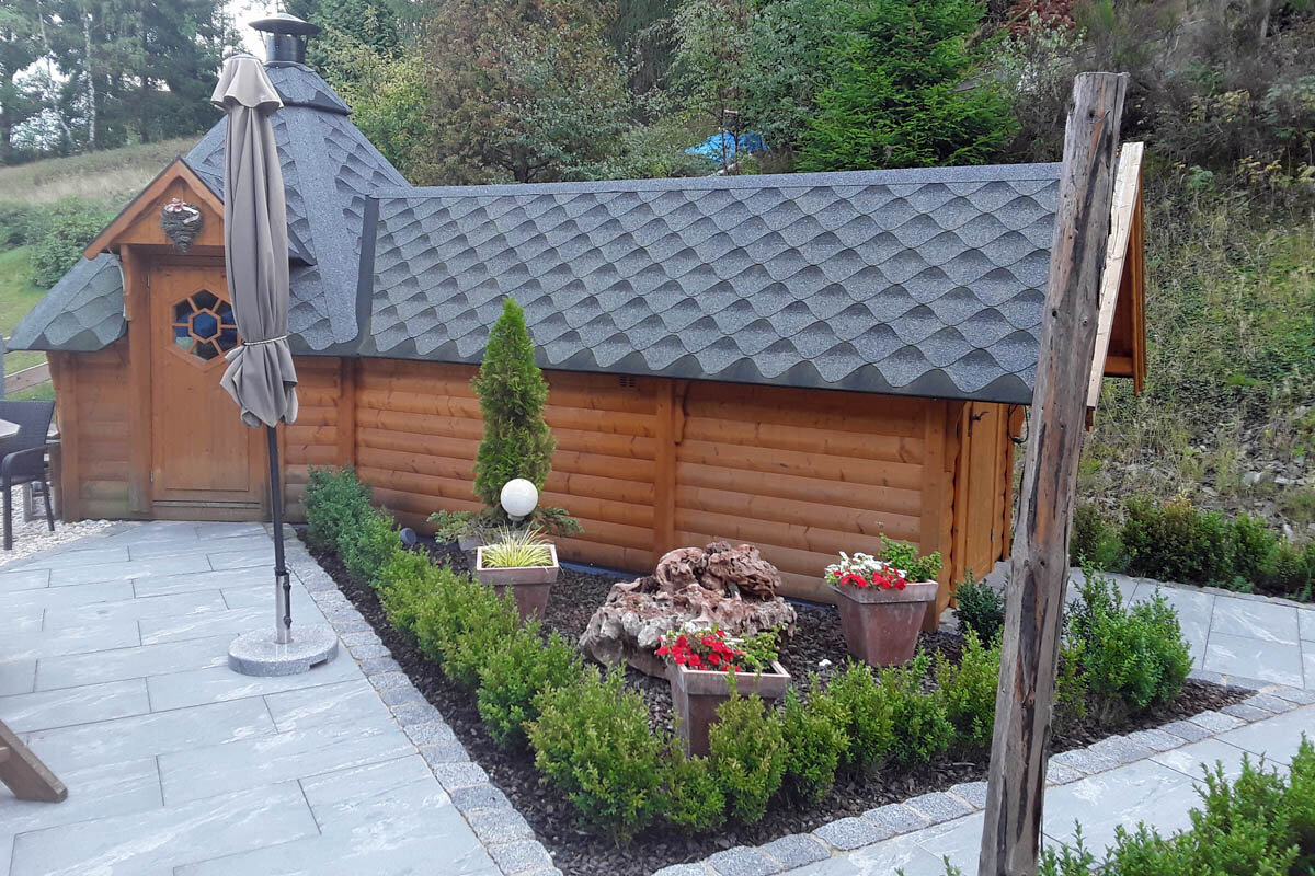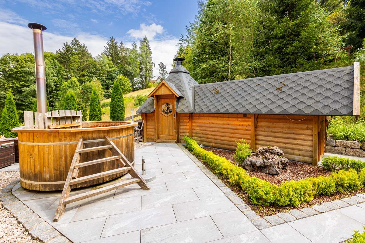 Seit 2018 verfügt unser Haus auch über ein Saunahaus im Garten mit Liegewiese und einen finnischen Badebottich.