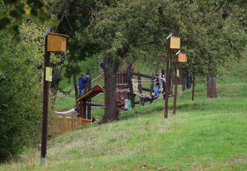 Auf dem Grundstück befinden sich neben dem Gebäude eine großzügige Außenanlage mit Sitzgelegenheiten, ein Biotop, ein Kräuter- und Tastgarten, ein Grillplatz, ein Spielplatz und auch ein Parkplatz.