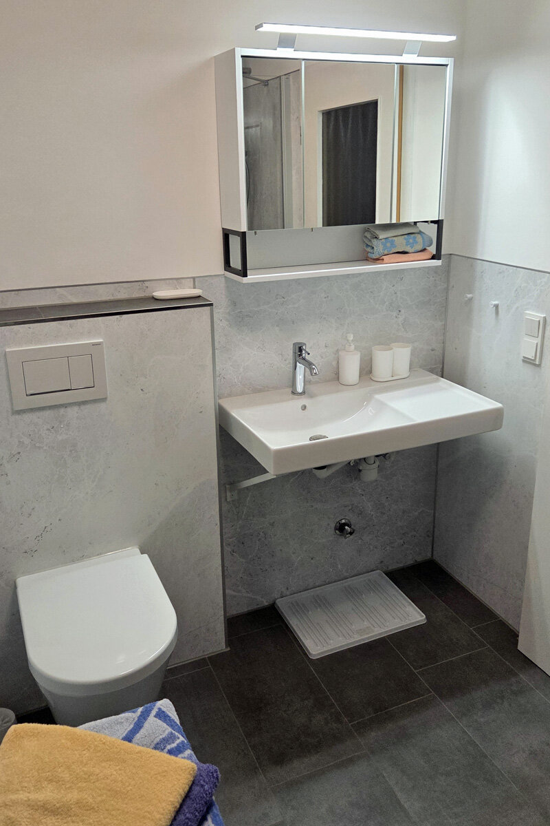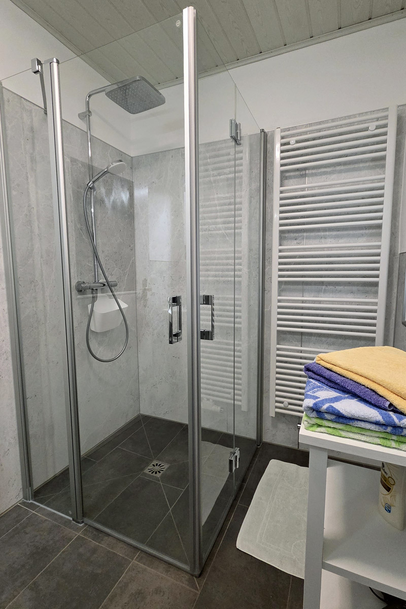 Das neu gestaltete Badezimmer in Fugenlos-Optik bietet eine komfortable, ebenerdige Regendusche und einen Handtuch-Heizkörper.