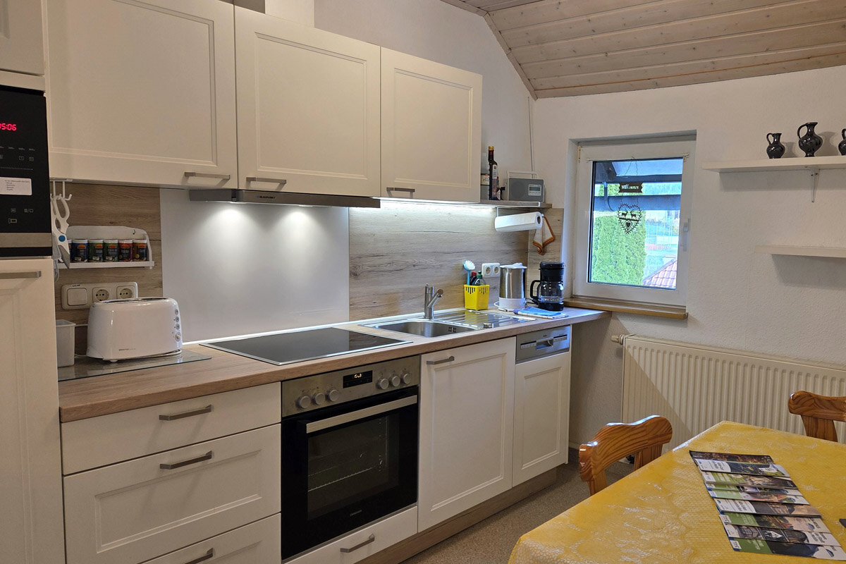 Die geräumige Ferienwohnung „Rennsteig“ ist für 4 Personen eingerichtet. Sie befindet sich im 1. Obergeschoss und hat 2 große Schlafräume für je 2 Personen.