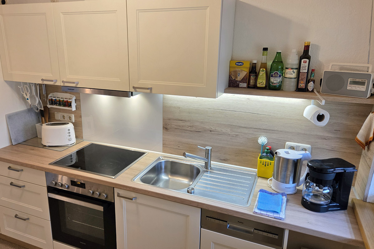 Sie besteht aus einem gemütlichen Wohnraum, angrenzender Küche mit Essbereich, dem Schlafraum und einer Dusche/WC. Die Küche ist voll ausgestattet mit Kühl-Gefrierschrank, Herd-Backofen, Mikrowelle und Geschirrspülmaschine. Filter-Kaffeemaschine, Toaster und Wasserkocher sind ebenso vorhanden. Eine Grundausstattung an Gewürzen, Bratöl und Filtertüten für die Kaffeemaschine stellen wir für Sie bereit.