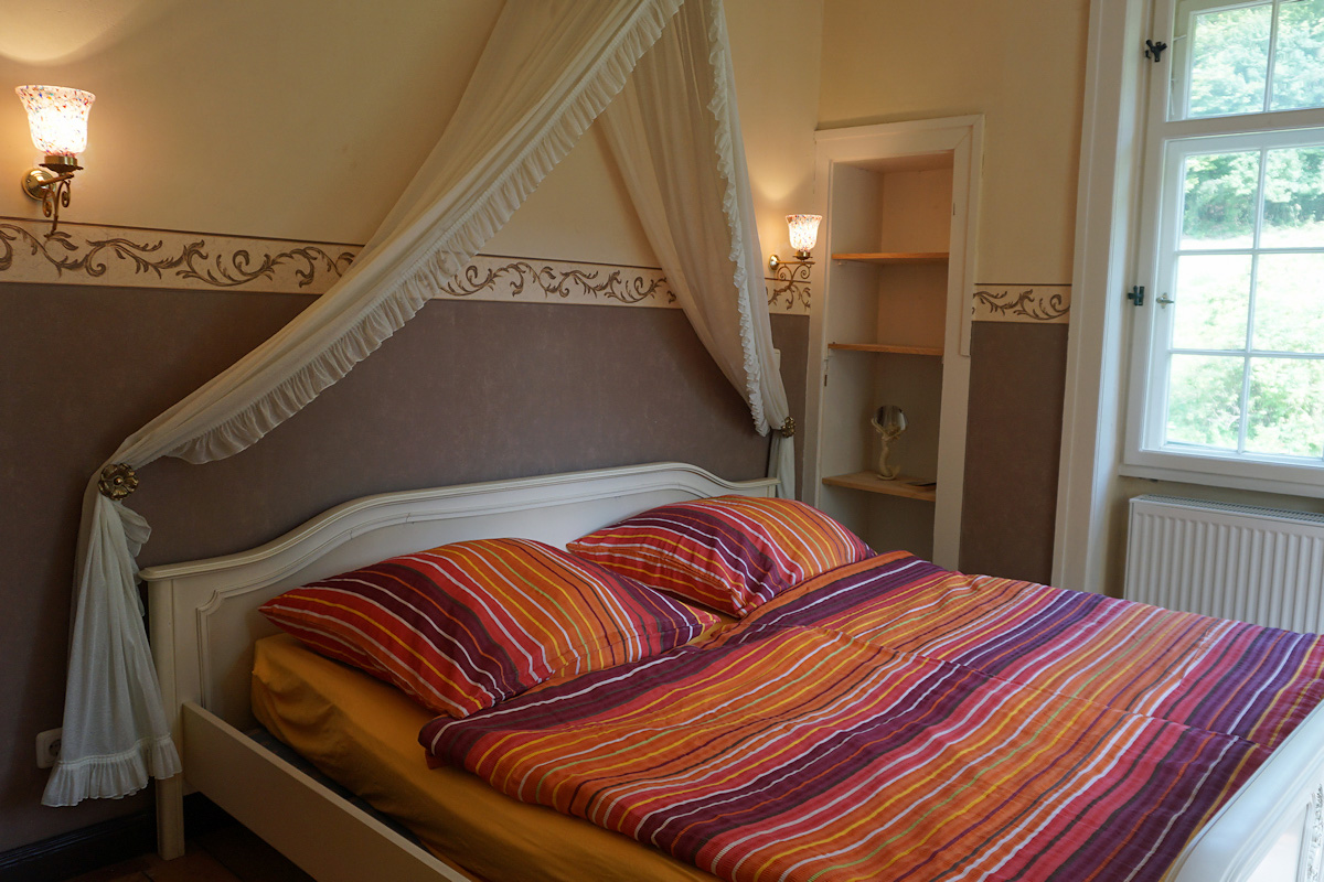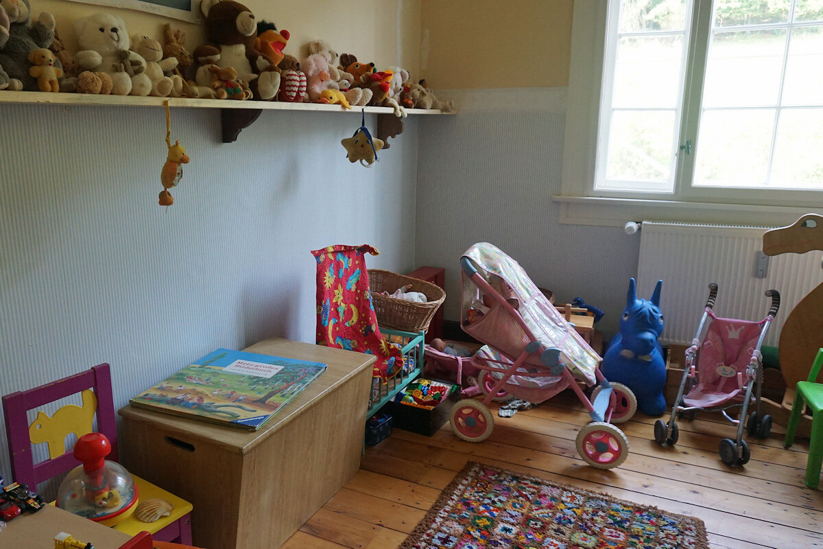 Im Mansardengeschoss: Großes Elternschlafzimmer mit Himmelbett, Bad, zwei Einzelschlafzimmer, ein großes Kinderschlafzimmer mit Etagen- oder auf Wunsch Gitterbetten, Kinderspielzimmer voller Spielsachen (Kasperletheater, Stofftiere, große Holzeisenbahn, Bilderbücher, Puppen, Spiele und vielem anderen).