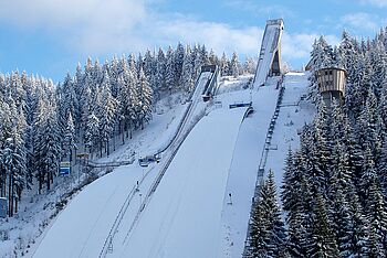 Der sieben Kilometer lange Winterradweg zeichnet sich auf 200 Höhenmetern durch leichte Anstiege und Abfahrten, eine wunderschöne Naturkulisse mit verschneiten Wäldern und tollen Panoramablicken aus – beispielsweise an der Touringen-Stempelstelle Wadebergblick. Zudem entdecken Sie berühmte Spitzensportstätten rings um die Wintersportregion Oberhof – von der Schanzenanlage am Kanzlergrund über die Rennrodelbahn Oberhof bis zum Biathlon-Stadion Lotto Thüringen Arena am Rennsteig.