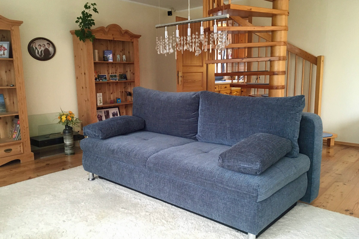 Erdgeschoss befinden sich das Wohnzimmer mit direktem Zugang zur Terrasse und die Küche mit Sitz- und Essgelegenheiten (Hochstuhl für Kinder ist vorhanden). Die Couch im Wohnzimmer lässt sich blitzschnell in ein Bett für zwei Personen verwandeln.
