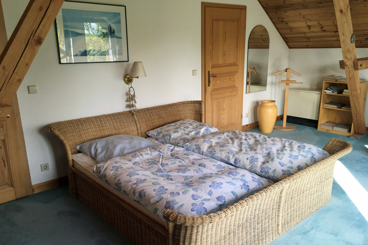 Obergeschoss befinden sich ein Badezimmer und das Schlafzimmer mit einem Doppelbett für zwei Erwachsene. Für die Kinder kann ein Luftbett und ein Reisebett zur Verfügung gestellt werden.