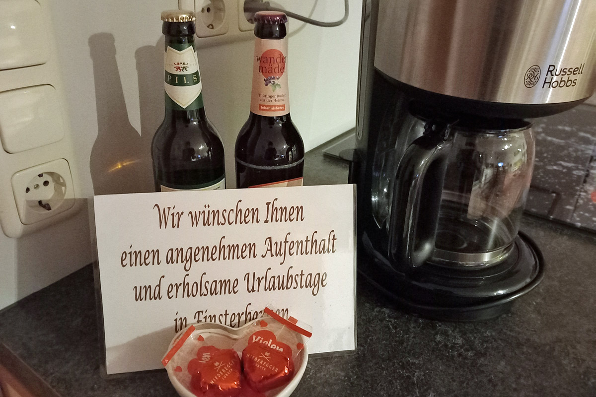 Die Küchzeile ist u.a. ausgestattet mit Cerankochfeld, Kaffeemaschine, Wasserkocher, Mikrowelle, Toaster, natürlich ausreichend Geschirr und Gläser.