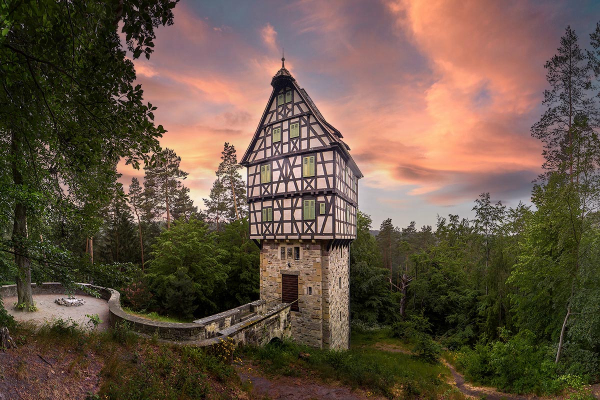 Unweit von Kahla befindet sich im Waldgebiet Rieseneck das als Herzogstuhl bezeichnete Jagdschlösschen. Vom Parkplatz am Chauseehaus (an der L1110 bei Hummelshain) sind es ca. 30 Minuten zu Fuß oder ihr fahrt weiter und parkt später direkt am Straßenrand. Die Jagdanlage ist öffentlich zugänglich und bietet besonders im Herbst oder bei Nebel das perfekte Licht.