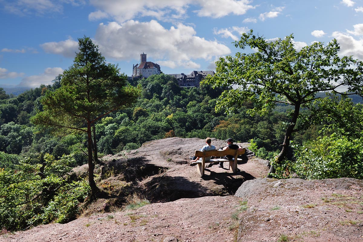 Mehr InformationenDie Wartburg bei Eisenach ist wohl das bekannteste Wahrzeichen von Thüringen und gilt zu Recht als die "deutscheste aller Burgen". Es gibt mehrere Positionen, von wo aus die Burg fotografiert werden kann, z. B. vom Metilstein, wie hier zu sehen.