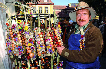 Der Weimarer Zwiebelmarkt ist das älteste Volksfest Thüringens und findet alljährlich im Oktober statt. Ursprünglich als regionaler Bauernmarkt im 17. Jahrhundert entstanden, hat sich der Markt zu einem Großereignis entwickelt, das mehrere Hunderttausend Besucher anzieht. Zentrum des Festes ist die Zwiebel, die in kunstvoll geflochtenen Zöpfen, sogenannten „Zwiebelzöpfen“, verkauft wird. Neben dem traditionellen Marktgeschehen bietet der Zwiebelmarkt ein umfangreiches Kulturprogramm mit Live-Musik, Theateraufführungen und Ausstellungen. Die gesamte Weimarer Altstadt verwandelt sich während des Festes in eine lebendige Bühne, auf der sich Thüringer Handwerkskunst und Kulinarik in ihrer ganzen Vielfalt präsentieren.