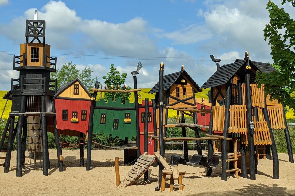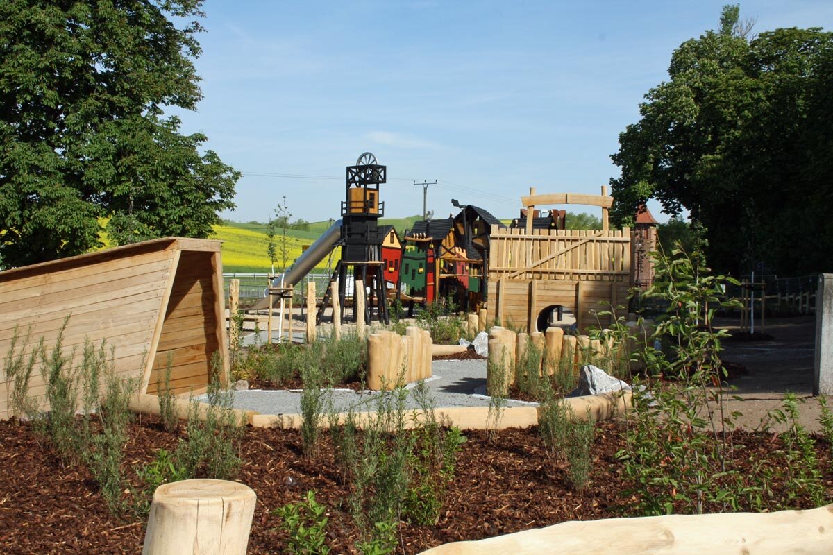 Hier dürfen sie sich wie richtige Bergleute fühlen, schließlich gibt es ein Bergwerkstädtchen, Loren und Bergwerksgänge. Viele weitere Spielgeräte unterstützen den Abenteuer- und Entdeckerdrang der Kinder und garantieren fantasievolle Spielerlebnisse. Zudem wird den Kindern an verschiedenen Stationen (Raben) geologisches Wissen in Bezug auf die Höhle und den GeoPark vermittelt.