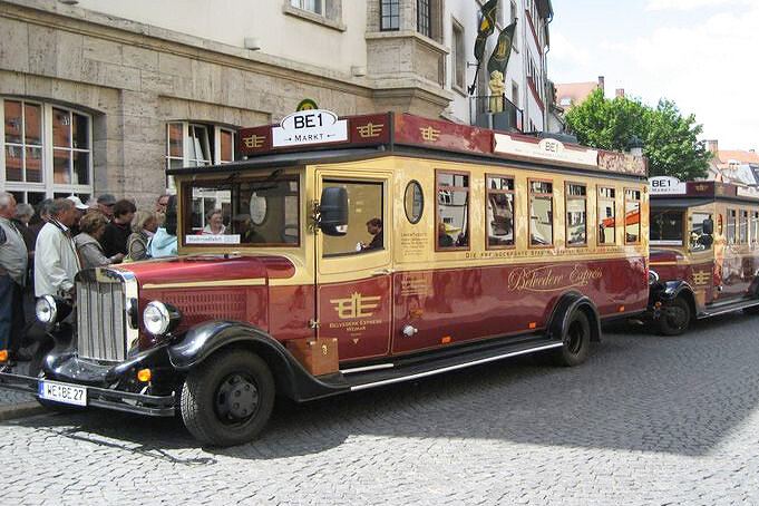 Wir fahren für Sie mit drei außergewöhnlichen Bussen, ausgerüstet mit Multimediatechnik zu allen wichtigen Stationen der Unesco-Welterbestätten Weimars. Den Stadtkern und die Peripherie von Weimar, welche der Stadtrundgang und die Kutschen generell nicht erreichen, bekommen Sie mit uns zu sehen und kompetent erläutert.