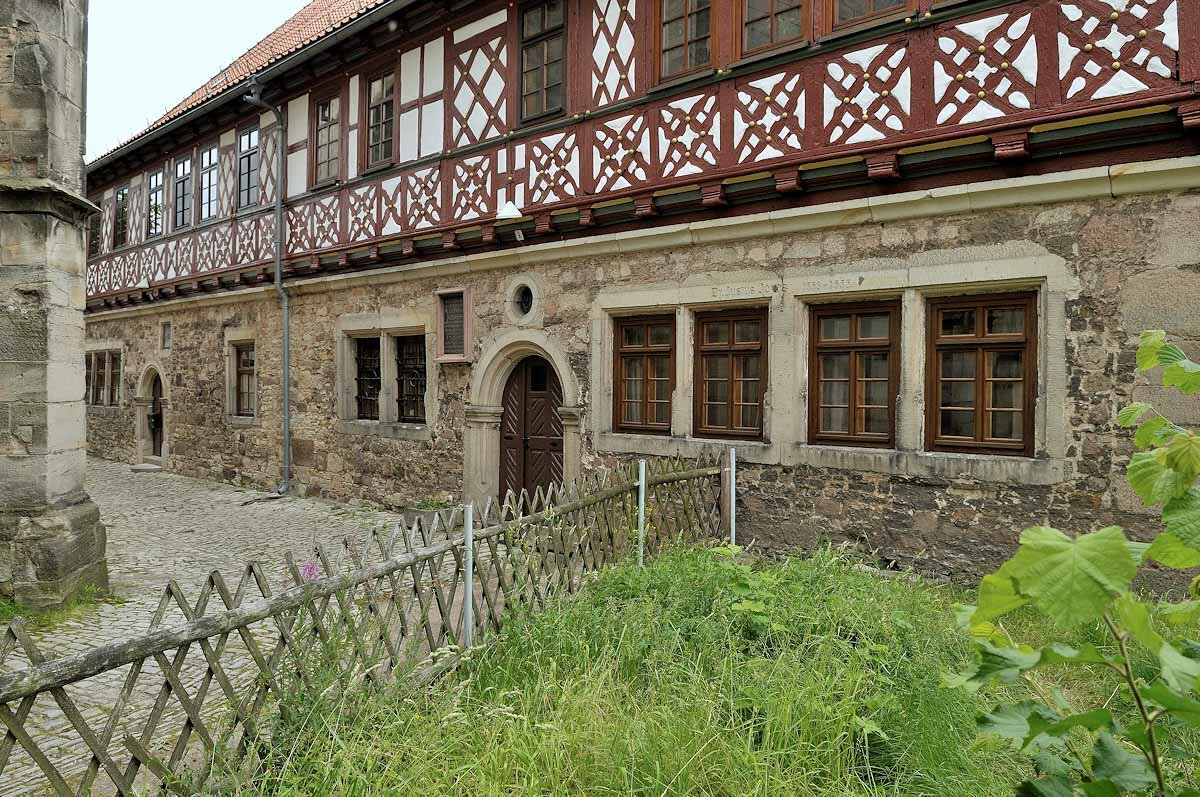 Das Schulgebäude wurde 1575 erbaut und später erweitert. Es ist das zweitälteste Schulgebäude Thüringens. Über dem Erdgeschoss aus Sandstein mit zwei Rundbogenportalen und mehreren Inschrifttafeln erhebt sich ein Fachwerkobergeschoss. Das "Schulmännle", eine spätmittelalterliche Steinplastik an der Ostecke der "Alten Schule", wird in der Volkssage als Schatzfinder und Stifter des Historischen Gebäudes gedeutet.