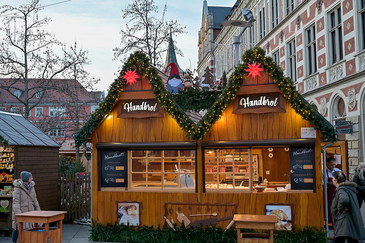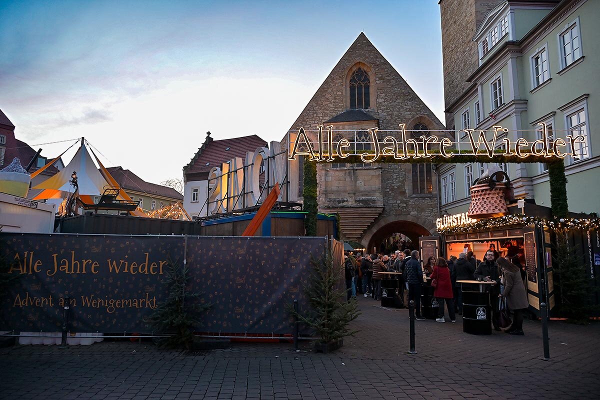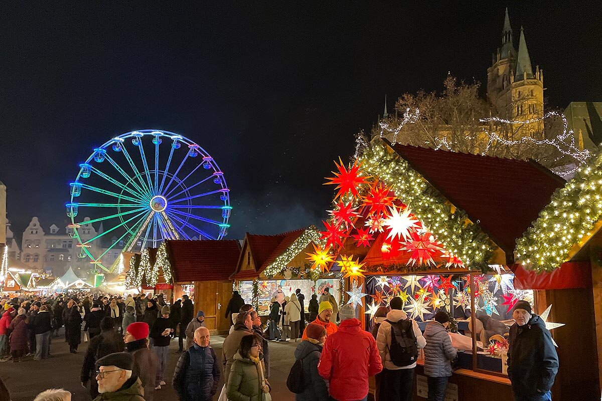 Der größte Weihnachtsmarkt Thüringens entfaltet seinen Zauber in der historischen Altstadt rund um Domplatz, Mariendom und Severikirche. Glänzende Lichter und der Duft der Buden schaffen eine festliche Atmosphäre. Mehr als 200 liebevoll dekorierte Holzhäuschen locken mit Thüringer Spezialitäten wie dem Erfurter Schittchen – einem der ältesten Christstollen des Landes – sowie der berühmten Thüringer Bratwurst, die auf keinem Thüringer Weihnachtsmarkt fehlen darf. Ergänzt wird das Angebot durch kunstvolle Handwerksarbeiten: Christbaumschmuck, Blaudrucktextilien, Töpferwaren und erzgebirgische Volkskunst.