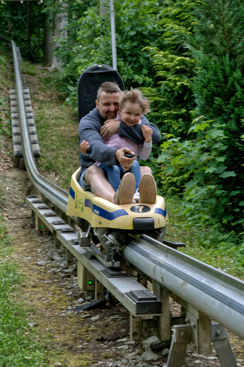 Oben angekommen beginnt die rasante Bergabfahrt, auf der Sie 111 m Höhenunterschied und bis zu 35 % Gefälle überwinden werden. Die abwechslungsreiche Fahrt ist 900 m lang und führt Sie durch steile Kurven hinab ins Tal. Das Tempo können Sie mithilfe eines Brems- und Beschleunigungshebels selbst bestimmen, wobei eine Maximalgeschwindigkeit von 40km/h erreicht werden kann.