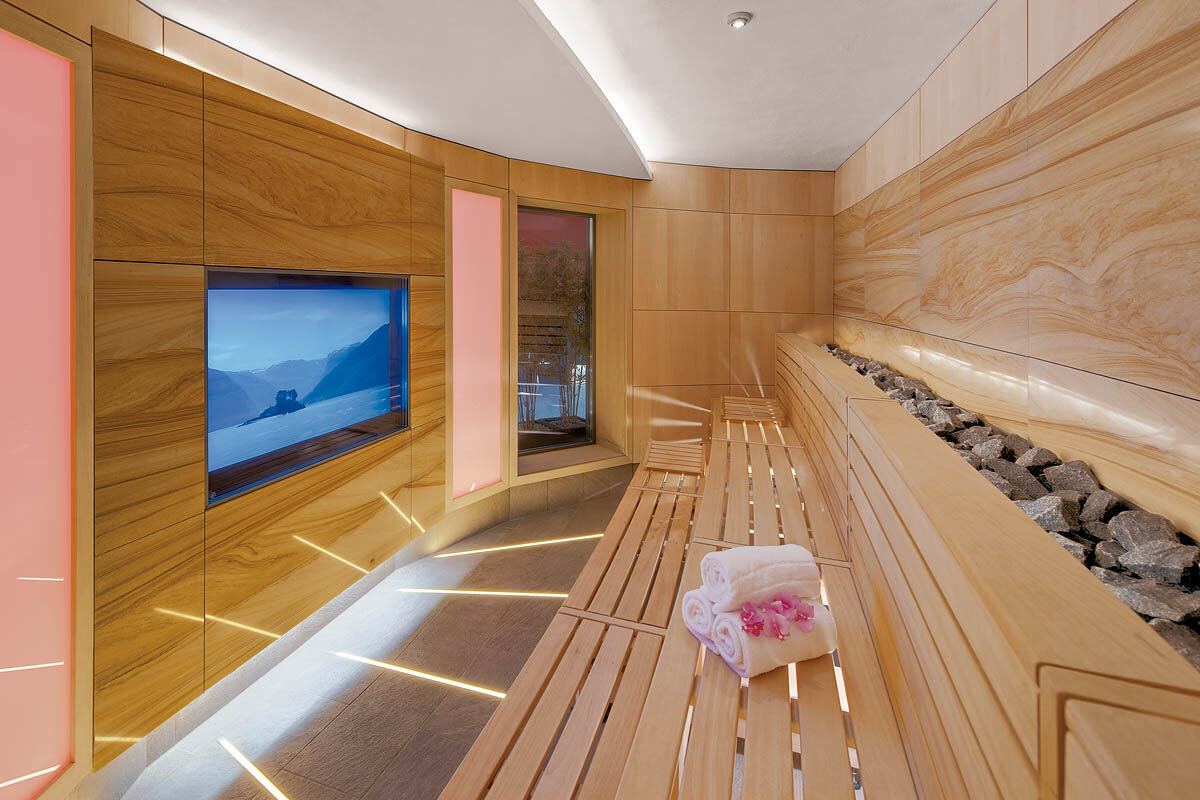 Warme Farben und natürliche Materialien, eine Lounge mit Kamin und feinem Teakholzboden umrahmen die Saunen unserer Wellness-Oase. Acht verschiedene Saunen laden zum Erholen und Genießen ein.