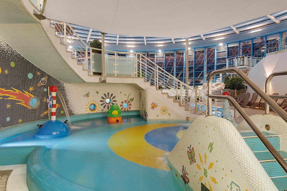 Kleine Gäste können ihren Tag im Babybecken und auf dem Innenspielplatz mit Kletterturm genießen. Im Außengelände erwartet Sie das beheizbare Schwimmbecken, ein Wasserspielplatz, eine Liegewiese, ein Beachvolleyballplatz und ein Kinderspielbereich.