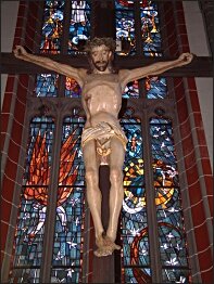 Wir beginnen unseren Rundgang mit dem Blick zum Chorraum. Dabei fallen besonders die neuen Glasfenster ins Auge. Der Berliner Maler Gerhard Olbrich hat sie entworfen, die Glaswerkstätten Franz Lehmann, Berlin- Weißensee, haben sie ausgeführt. 1961 wurden sie in die hohen gotischen Fenster eingebaut. Sie stellen Szenen aus dem letzten Buch der Bibel, der Offenbarung des Johannes dar: Im Mittelfenster erscheint Christus als Weltenrichter im Strahlenkranz ("Mandorla"). Aus dem Mund Christi geht ein Schwert hervor, Symbol für das Wort Gottes. Das Lamm neben ihm hat sieben Augen und sieben Hörner als Zeichen der Stärke und Weisheit; es weist auf den für die Sünden der Menschen geopferten Christus hin. Weiter unten erkennt man die Symbole der vier Evangelisten: Engel - Matthäus, Stier - Lukas, Löwe - Markus, Adler - Johannes. Darunter befreit Michael eine sonnenumstrahlte Frau (Maria auf der Mondsichel), von dem Drachen - Sinnbild für die Bedrängung der Gemeinde. Das linke Fenster zeigt Christus, den lebendigen Herrn, inmitten seiner Gemeinde, repräsentiert durch 24 Älteste (zwölf auf der rechten Fensterseite), die Gott loben und ihn anbeten. Das rechte Fenster schildert das Endgericht: Die Posaunen erwecken die Toten zum Gericht und ewigen Leben.