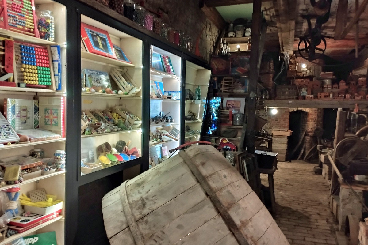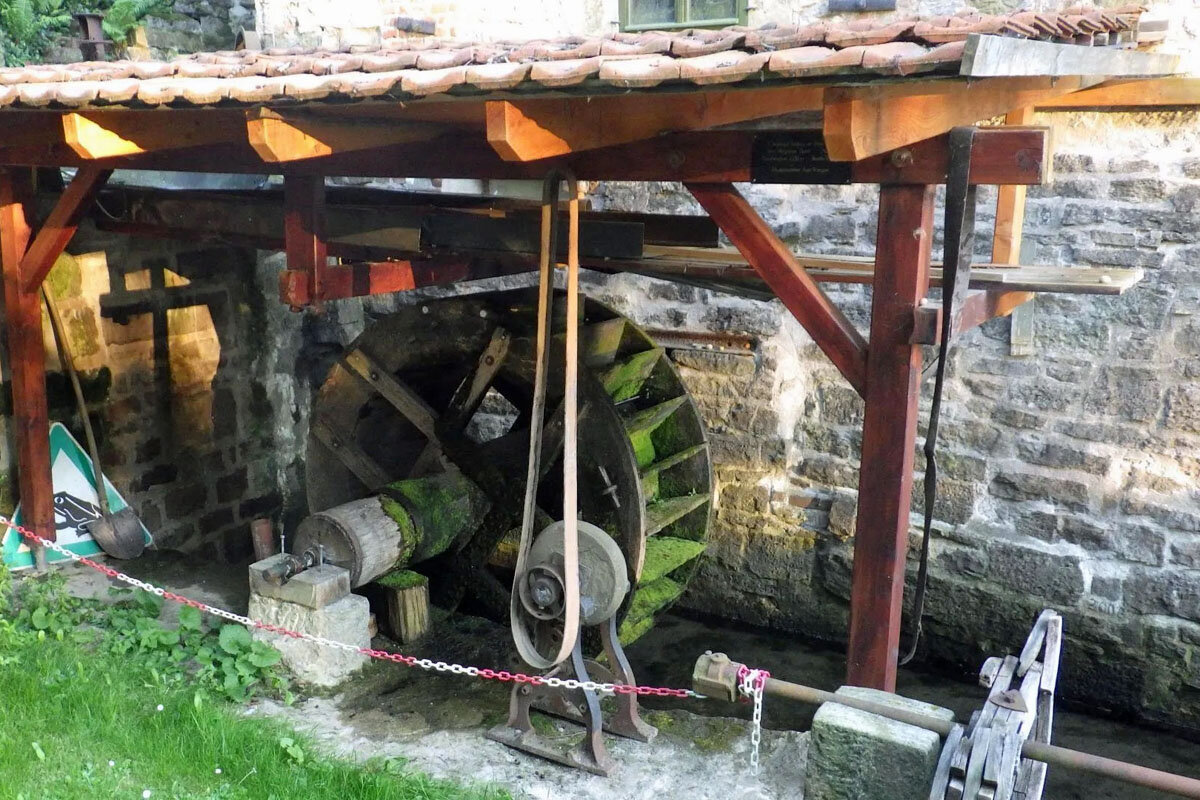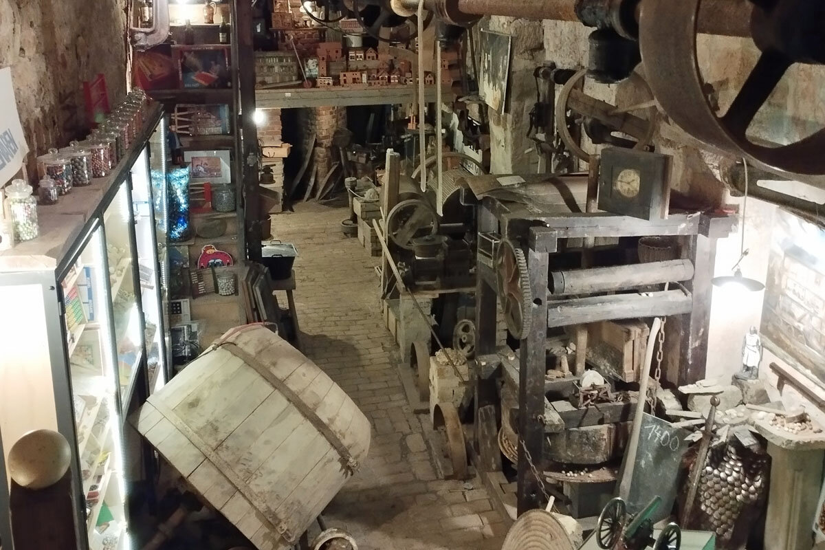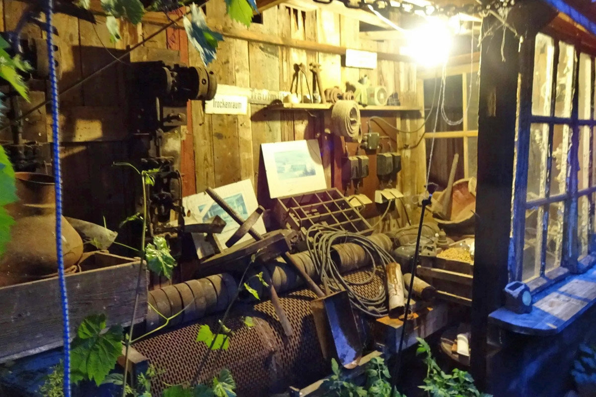 Die Museumsräume befinden sich im großen Keller des Gebäudes mit zwei Kammrädern, der Wassermühle sowie einer originalen Transmission von 12,50 m an der Decke.