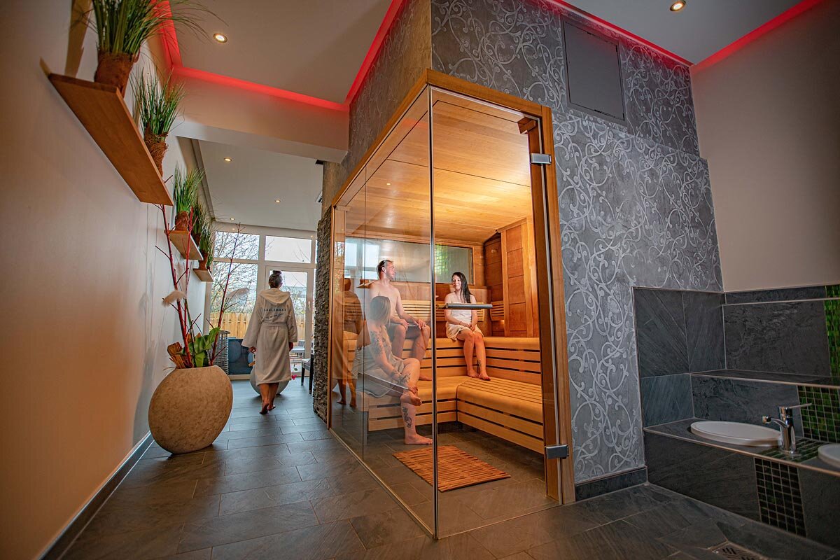 Grenzenlose Entspannung in unserem Saunabereich. Unsere Saunawelt besitzt neben den sechs Hauptsaunen eine liebevoll gestaltete Dampfsauna und eine Wohlfühlsauna mit separaten Liegebereich. Lassen Sie sich von unserem Team und dem aktuellen Aufgussprogramm in der 90°C oder 75°C-Sauna verwöhnen. Die Aufgussthemen wechseln je nach Jahreszeit. Die neu erbaute Panoramasauna „Thüringer Aufguss Scheune“ bietet einen wunderbaren Blick in den Saunagarten.