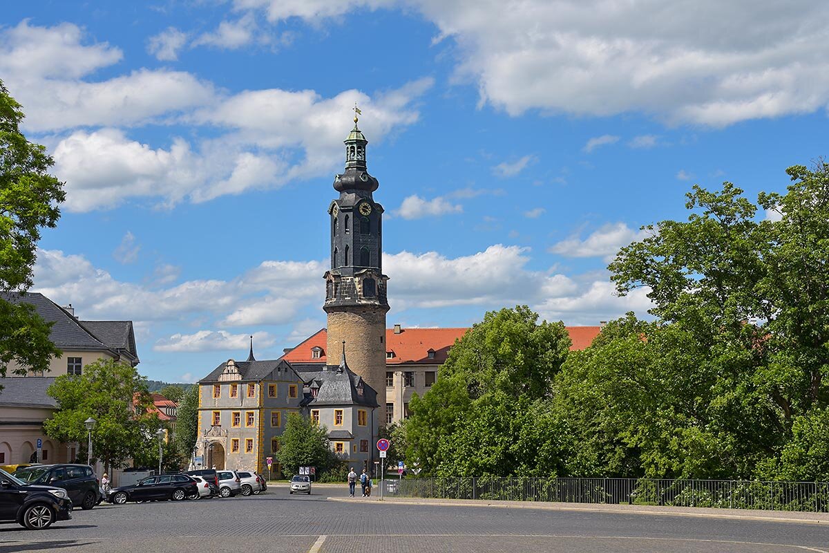 Das Weimarer Schloss, ehedem eine mittelalterliche Wasserburg, erhielt im 16. Jahrhundert repräsentativen Anspruch, als der protestantische Kurfürst von Sachsen, Johann Friedrich I., im Schmalkaldischen Krieg eine Niederlage erlitt, folglich die Kurwürde und das Kurland Wittenberg verlor und seine Residenz nach Weimar verlegte. Ihm folgte 1552 sein Hofmaler Lucas Cranach nach Weimar. Im 17. Jh. als barocke Vierflügelanlage geplant, wurde das Schloss als Dreiflügelanlage im französischen Stil vollendet. Ein Brand von 1774 zerstörte es bis auf die barocken Außenmauern. Für den Klassizismus bedeutende Architekten wie Johann August Arens, Nicolaus Friedrich Thouret und Heinrich Gentz wurden auf Goethes Betreiben für die Neugestaltung gewonnen. In den Jahren 1913/14 entstand unter Großherzog Wilhelm Ernst II. ein vierter Flügel im neobarocken Stil an der Südseite. Seit 1923 wird das Schloss museal genutzt.