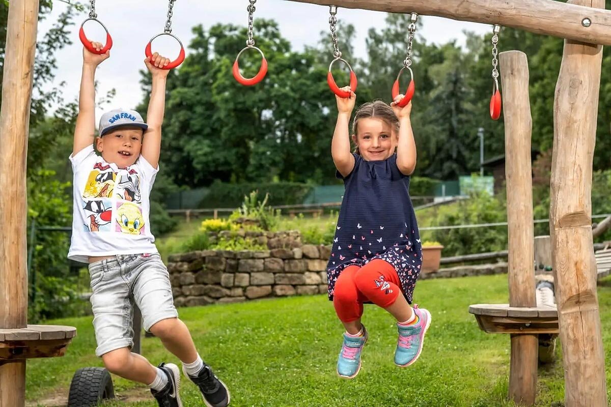 Unser Abenteuerspielplatz bietet Kindern eine naturnahe Spielwelt zum Klettern, Balancieren und Entdecken. Der nahegelegene Imbiss versorgt euch mit leckeren Speisen, Eis, Kuchen und Wein aus der Region. Genießt dabei den weiten Blick über die Landschaft, während eure Kinder sich austoben – Entspannung pur für die ganze Familie!