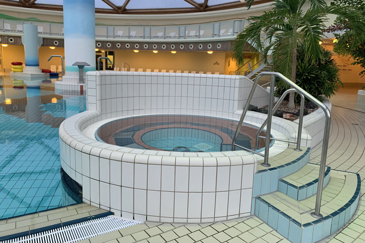 Im 1,35 m tiefen und 30°C warmen Erlebnisbecken kommen Sie voll auf Ihre Kosten! Wasserspeier, Massagedüsen, Bodensprudler, entspannende Whirlliegen, ein großer Strömungskanal sowie mehrere, speziell für Schwimmbäder entwickelte, Reifen und „Bananen“ bieten so einige Möglichkeiten der Unterhaltung für Groß und Klein.