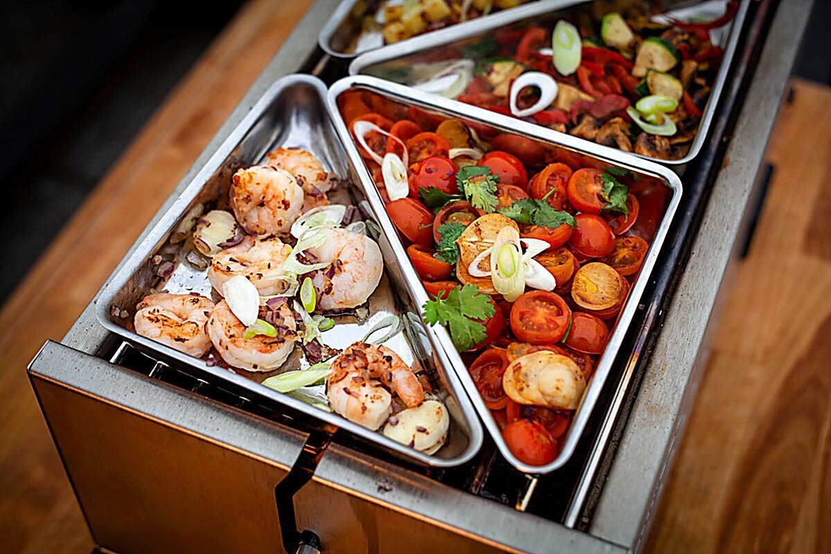 So kann jeder Grillfreund seinen THÜROS Grill, seine fahrbare Grillstation oder seinen Grilleinsatz zum wahren Alleskönner auf- oder nachrüsten. Das Windansteckblech ist beispielsweise ein Multifunktionszubehör, ermöglicht es doch nicht nur die mehrfache Höhenverstellung des Grillrostes. Es dient darüber hinaus als Windschutz und als Trägereinheit für weiteres sinvolles Grillzubehör. Zum Windansteckblech gibt es einen Warmhalterost, verschiedene Fleischspieße, einen Fleischkorb und eine Grilltrommel. Alles „drehbare“ Zubehör wird mit Grillmotor angetrieben.