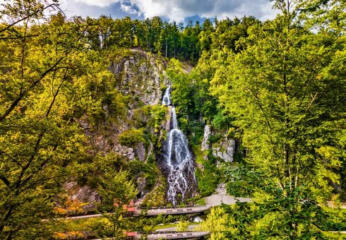 Auf einer Strecke von 3,5 km schlängelt sich der künstlich angelegte Wasserfallsgraben natürlich und harmonisch durch die Waldlandschaft. An der Stelle, wo die Felsauftürmungen aus vulkanischen Aktivitäten besonders plastisch und markant hervortreten, stürzt das Wasser in drei Kaskaden tosend 58 Meter in die Tiefe in ein Sammelbecken, bevor es dann wieder seinen Weg im eigentlichen Flussbett nimmt. Über 228 Stufen kann der Gast den Wasserfall besteigen.