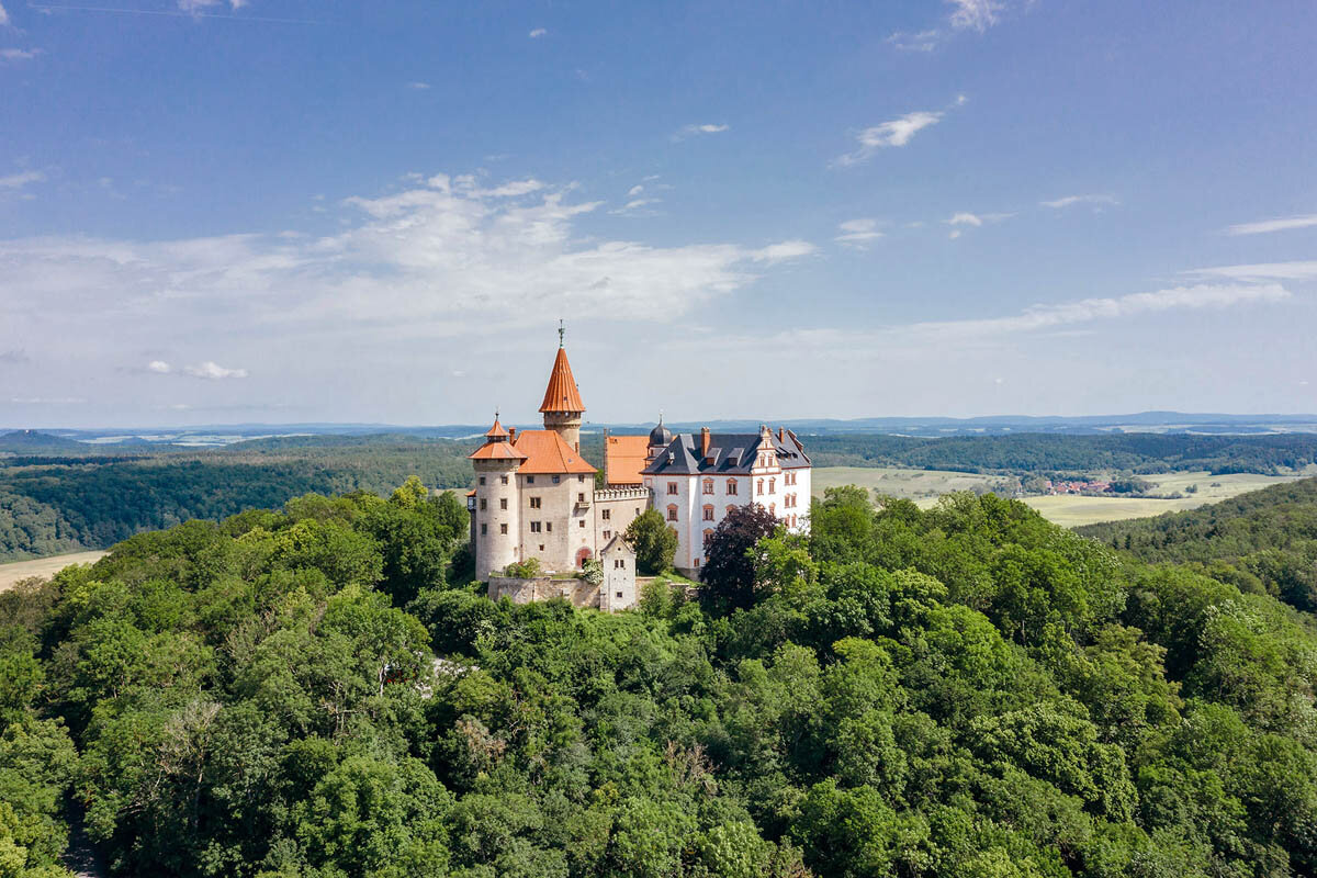Wie ein Märchenschloss überragt die Veste Heldburg auf einer bewaldeten Bergkuppe die schöne südthüringische Landschaft. Die Burganlage geht wohl auf das 12. Jahrhundert zurück.