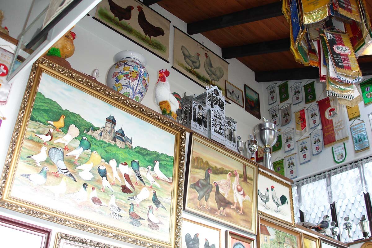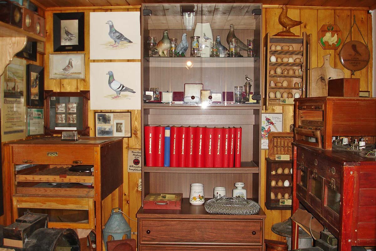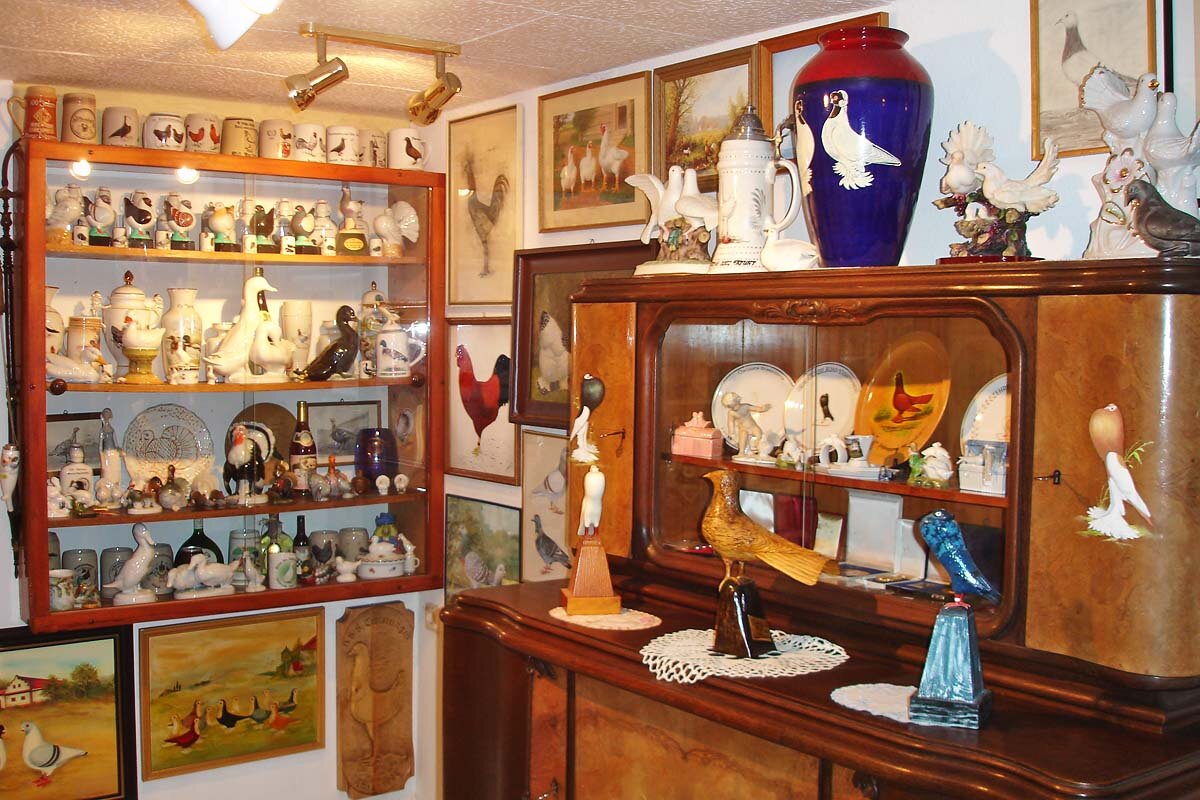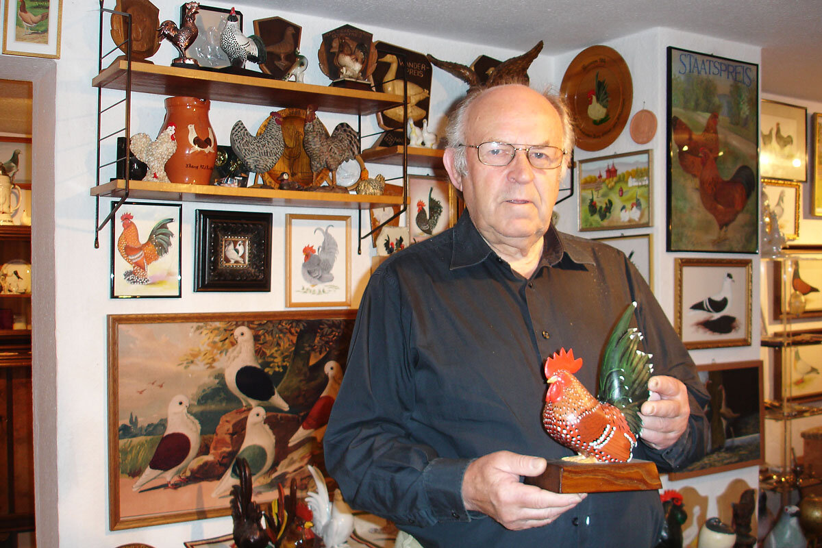 Das Zusammentragen von Antiquarem der Rassegeflügelzucht ist sein großes Hobby geworden. Seit Jahrzehnten sammelt er alles über die Rassegeflügelzucht. Ob Gemälde, Zeichnungen, Skulpturen, Urkunden, Pins, Medaillen oder Porzellan, viele seiner Exponate geben die Geschichte aus vergagenen Zeiten wieder.