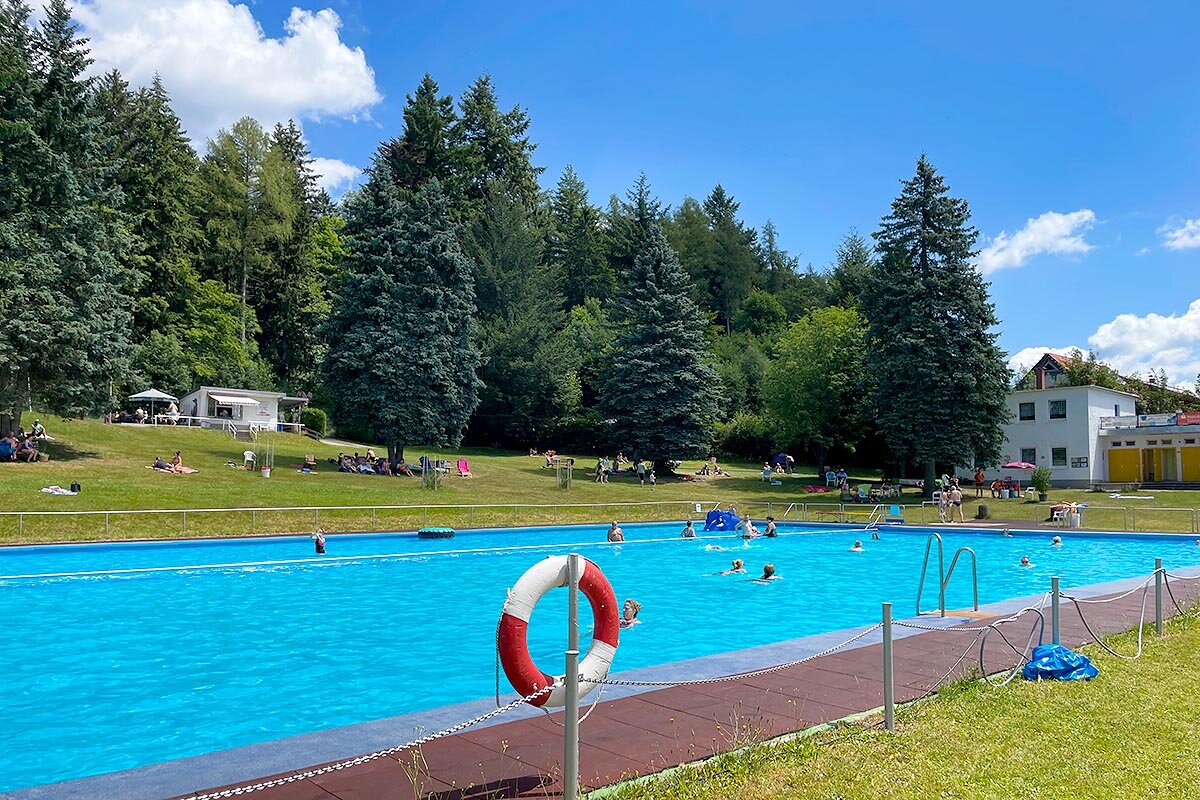 Das Waldbad / Freibad in Goldlauter-Heidersbach, hat seinen Namen zu recht. Es liegt etwas hanglagig auf ca. 630 m NN am Ortsrand von Suhl-Heidersbach und doch mitten in der Natur. Durch seine südwestliche Hanglage hat das Bad fast ganztägig Sonnenschein, aber durch seinen alten Baumbestand auch schattige Plätzchen.
