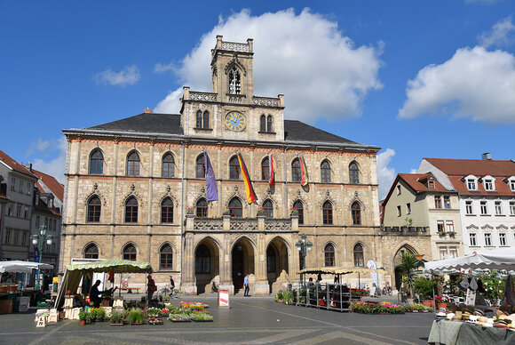 Im Zentrum Weimars befindet sich das Rathaus am Marktplatz. Das neugotische Gebäude wurde 1841 errichtet und gehört ebenfalls zu den Wahrzeichen Weimars und ist bereits der dritte Bau in der Funktion als Rathaus. Die drei Etagen lassen es zusammen mit dem repräsentativen Balkon und Glockenturm sehr prachtvoll erscheinen. In dem Glockenturm erklingen 35 Glocken aus Meißner Porzellan von Juni bis November mit verschiedenen Melodien. Der Marktplatz, an dem das Rathaus liegt, ist ein Standort vieler Veranstaltungen wie Märkte.